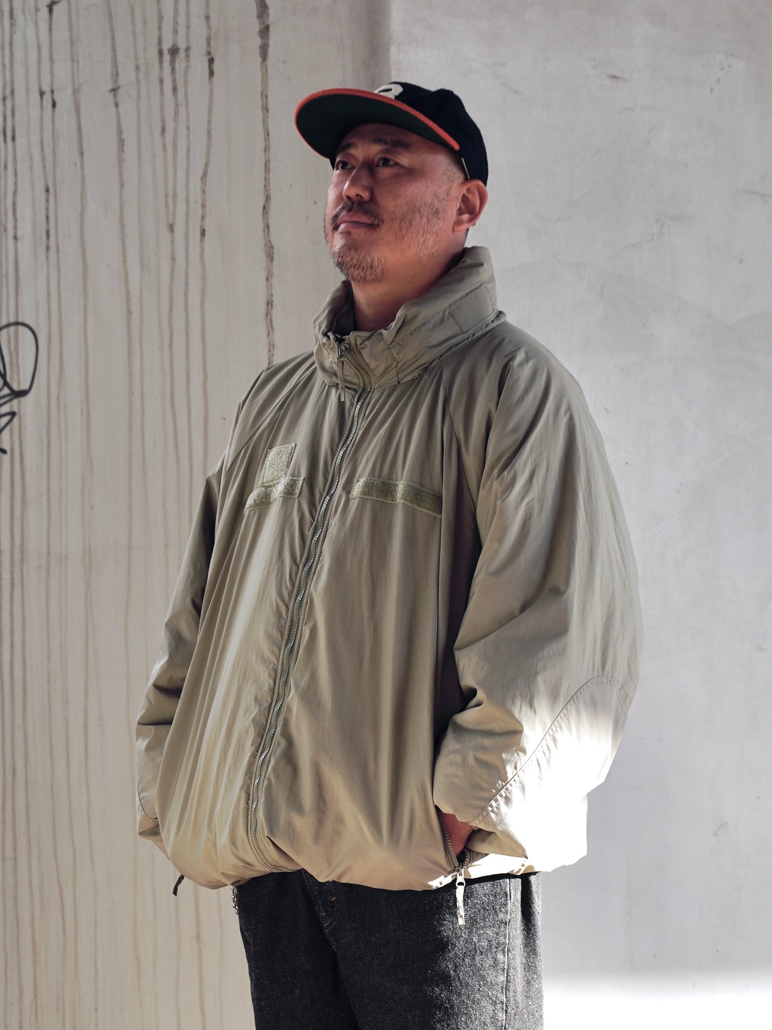 襟にフードが収納可能。肘は補強されています。フロントはダブルジッパー仕様。ジッパー開閉のサイドポケット内には裾を絞れるドローコード付き。メッシュ素材のインナーポケットや袖先はベルクロで調節可能なシンプルで洗練されたディテール。無駄を削ぎ落としたミニマルなルックスに、ミリタリーの機能性がしっかり落とし込まれた完成度の高いモデル。
