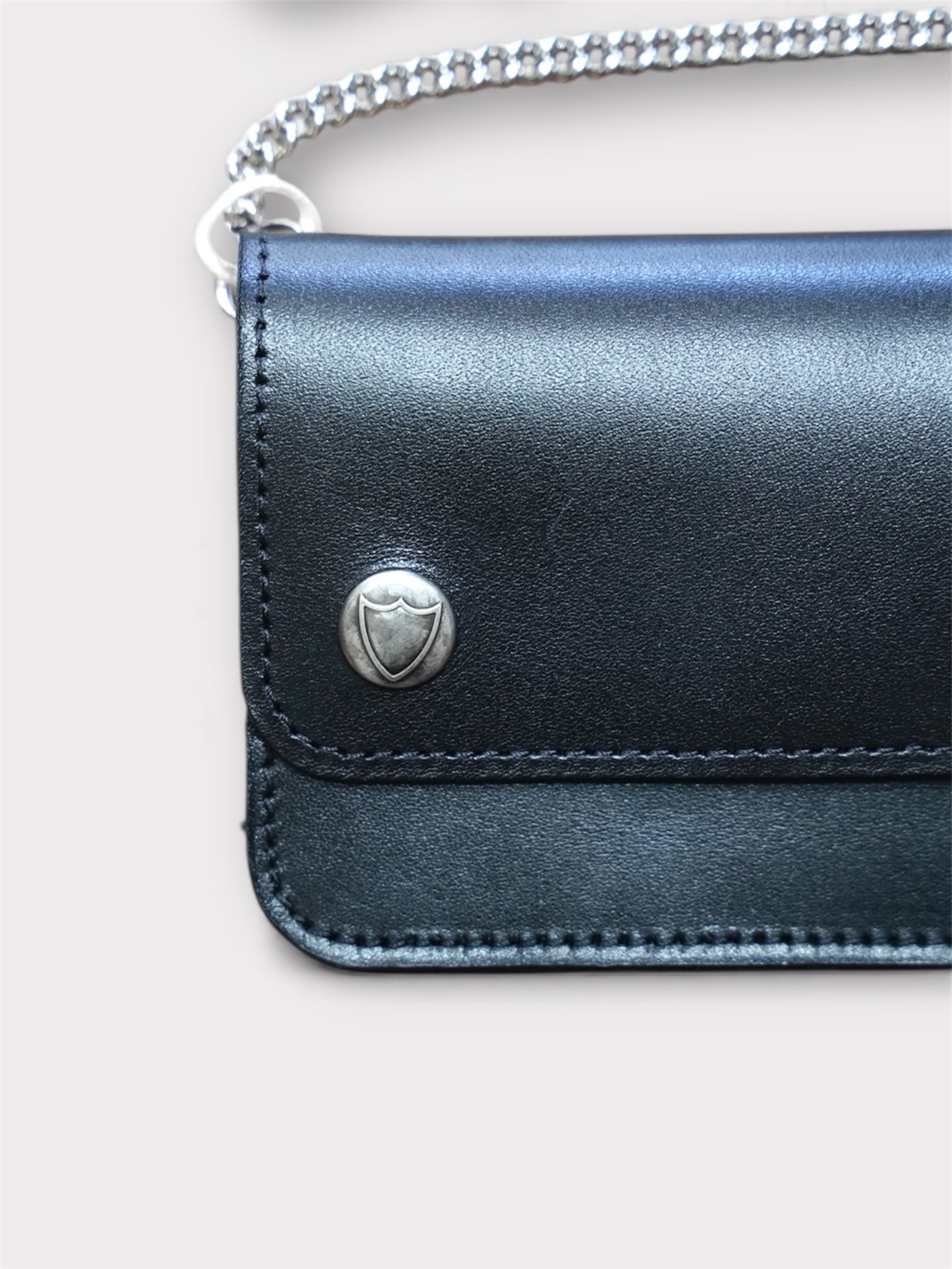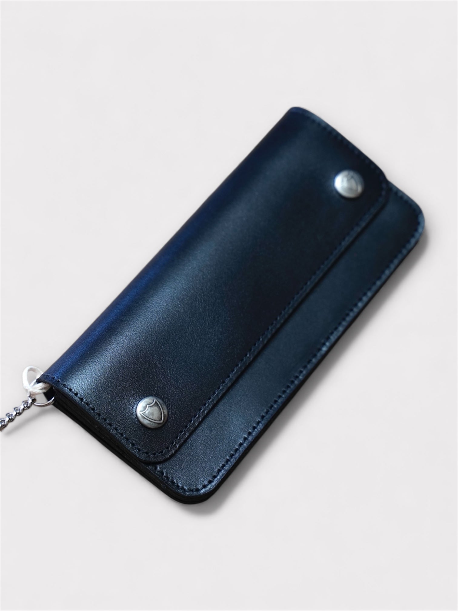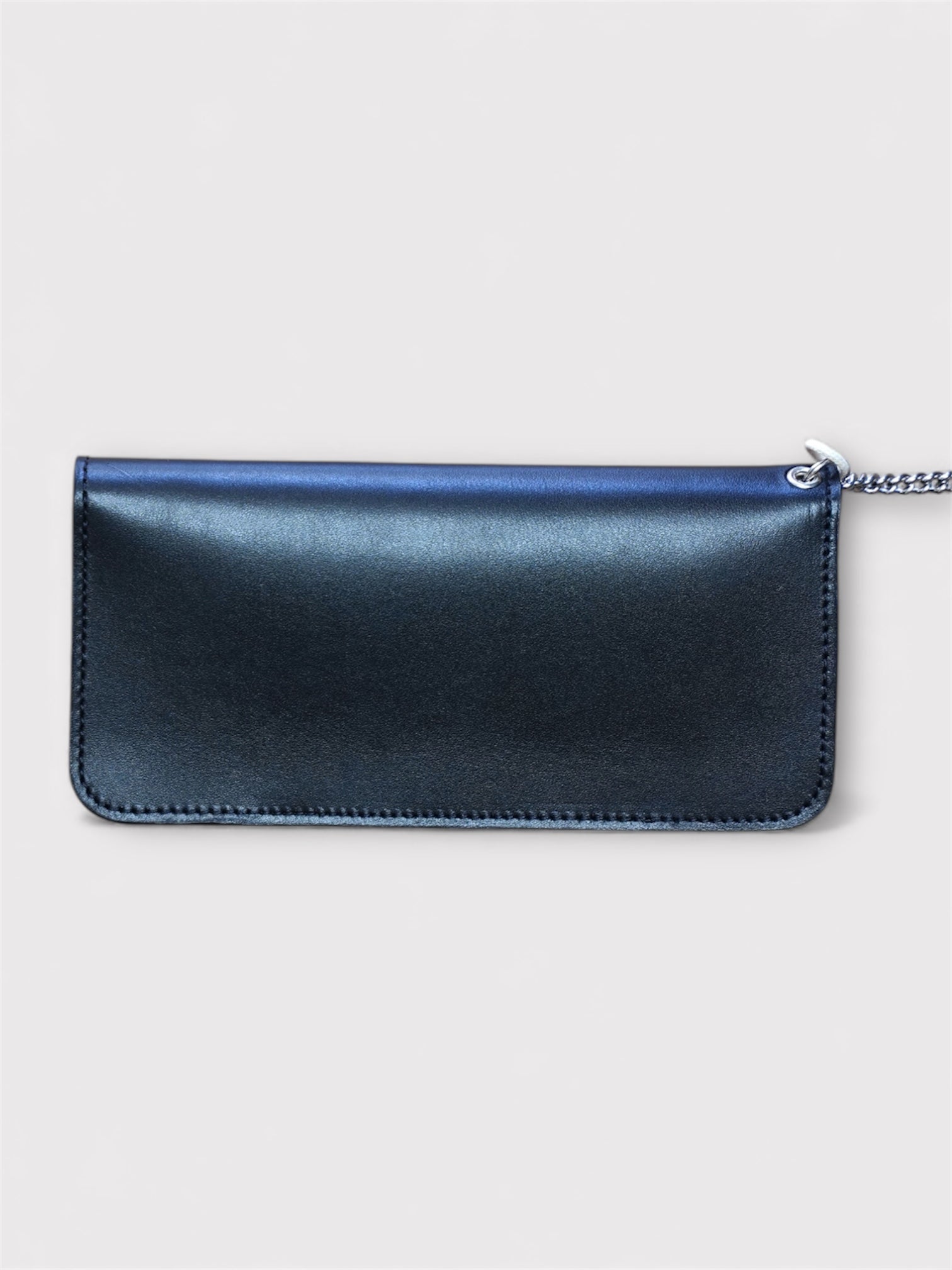 シンプルなデザインの財布にナスカンを組み合わせたウォレットチェーン。