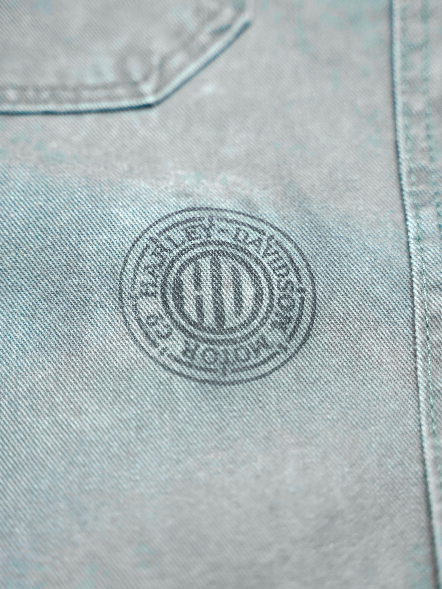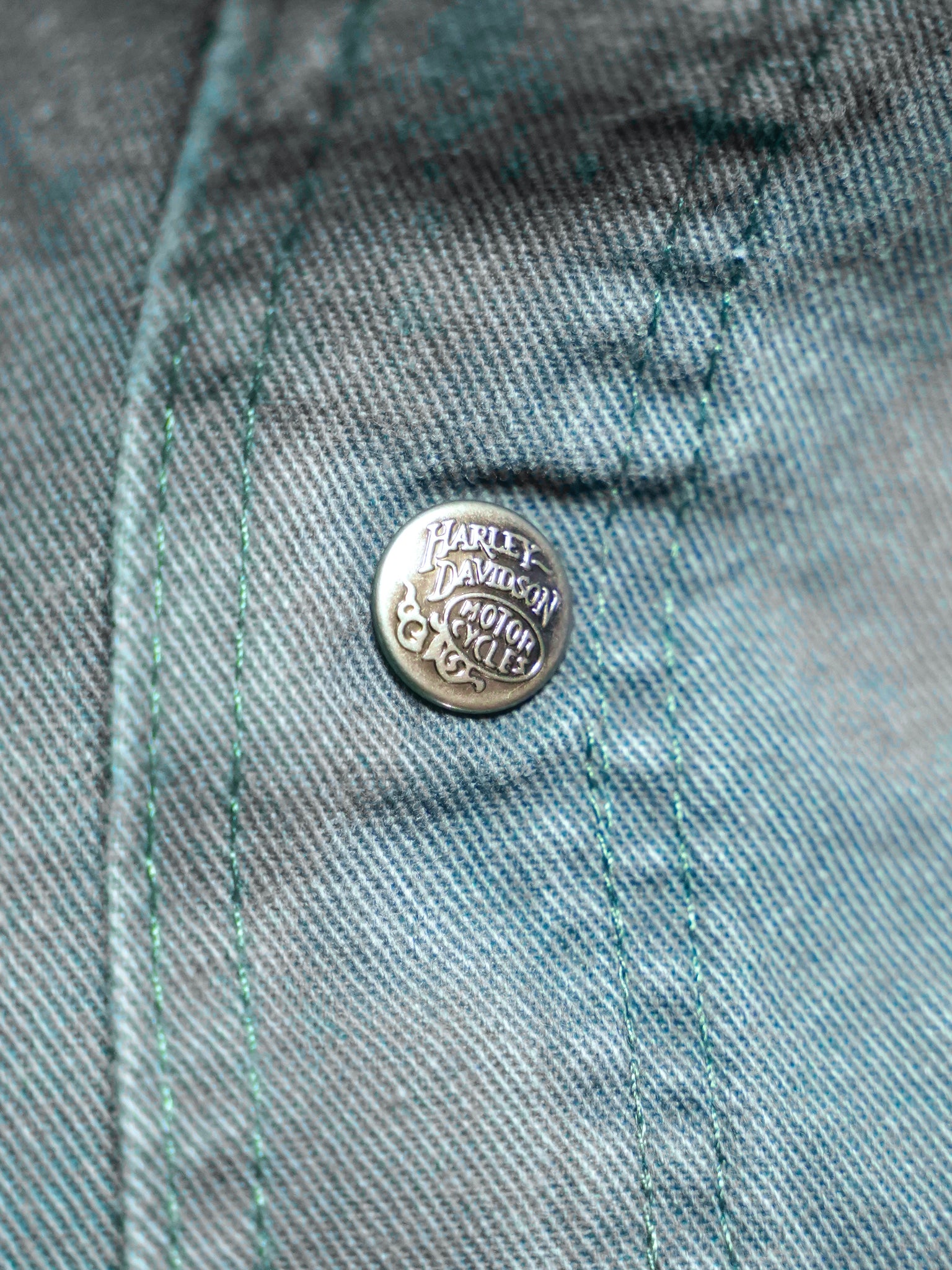 HARLEY-DAVIDSONの刻印入りスナップボタン。胸元にはステンシルプリント。