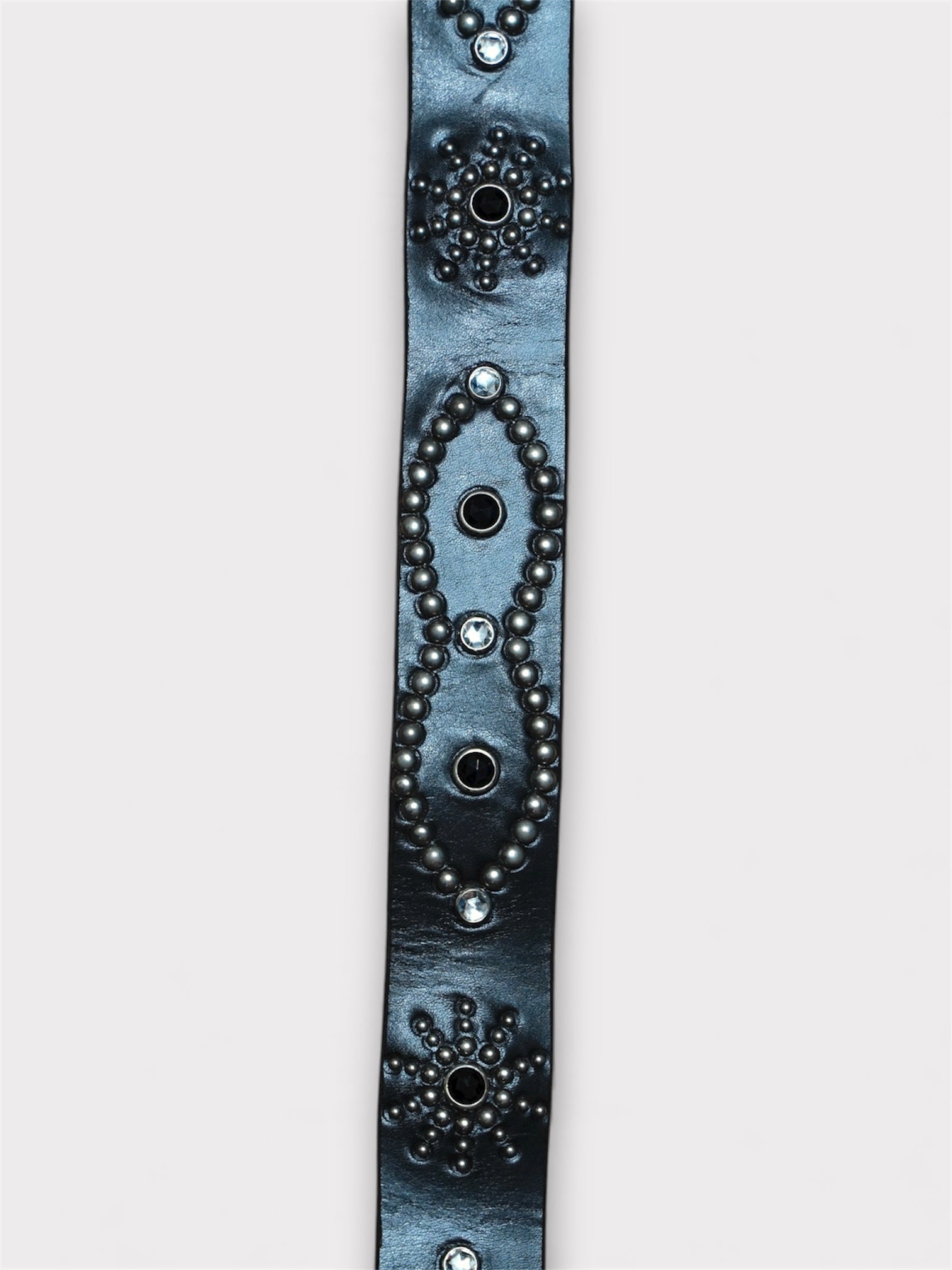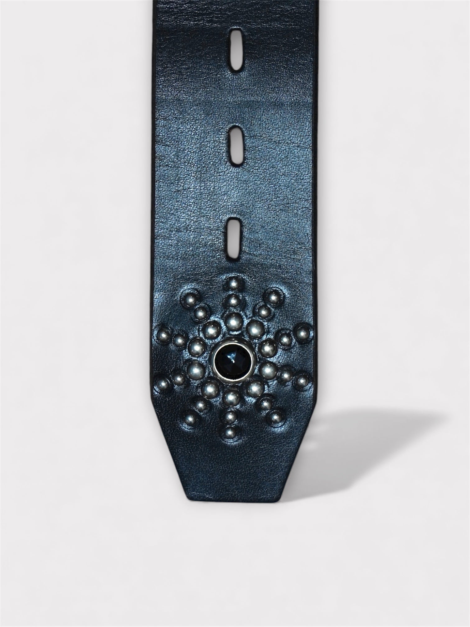 1.25インチのベースにHTC定番のフラワーモチーフのスタッズワーク を施したベルト。此方のモデルはベルトエンドにもフラワーが打ち込んであります。